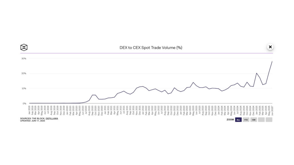 As more people come onchain, we expect to see decentralized exchange (DEX) usage increase relative to their centralized-exchange counterparts (CEXs) when it comes to trading crypto. The increasing ratio highlights the overall development of the DeFi ecosystem.