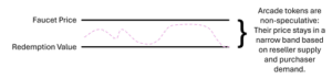 The economic dynamics of arcade tokens differentiate them from other kinds of tokens. Instead of granting holders ownership rights in the underlying ecosystem, arcade tokens grant holders the ability to access or use certain applications or services; crucially, their market value is designed to be programmatically bounded. This doesn’t require that arcade tokens be pegged to the price of a fiat currency like a stablecoin; it just means that an issuer can use certain mechanisms to effect a price floor and (often more importantly) a price ceiling.