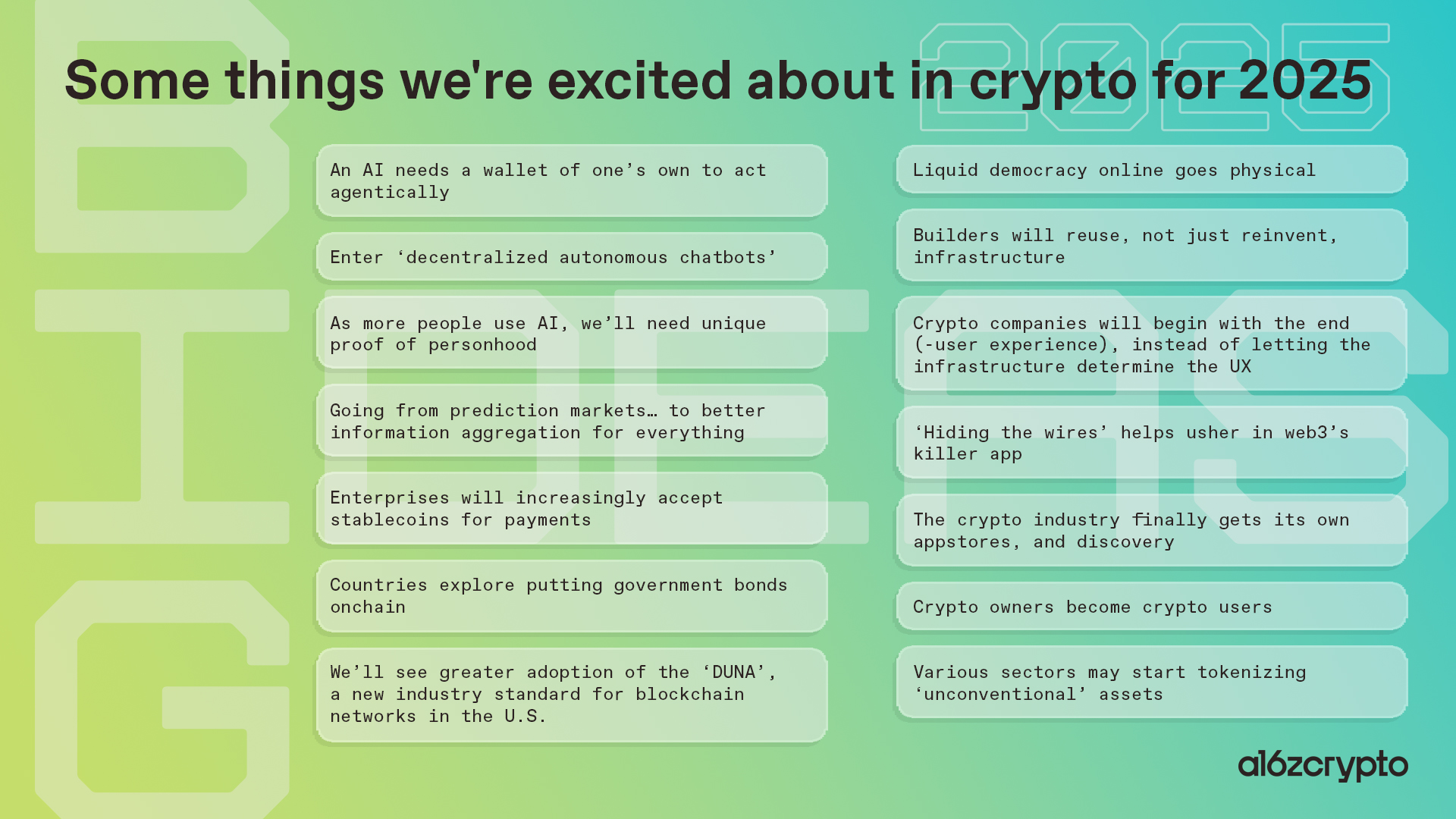 Editor’s note: a16z released its omnibus list of “big ideas” tech builders may tackle in the year ahead, according to partners across AI, American Dynamism, bio/ health, crypto, enterprise, fintech, games, infrastructure, and other areas. Below is a shortlist of some of the things that excite our various a16z crypto partners about what’s ahead. And for a 2025 outlook on policy, regulation, and more, check out this November 2024 post.