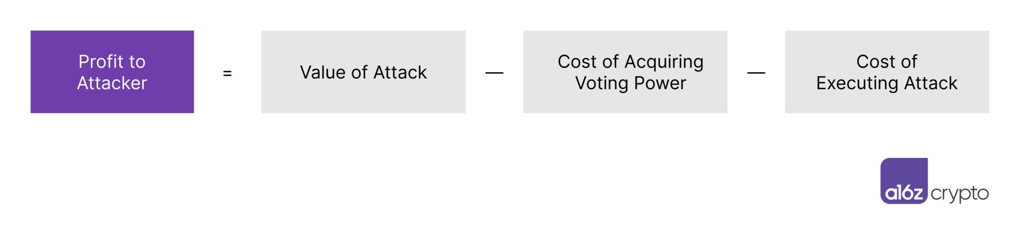 For a protocol to be considered secure against governance attacks, an attacker’s profit should be negative. When designing the governance rules for a project, this equation can be used as a guidepost for evaluating the impact of different design choices. To reduce the incentives to exploit the protocol, the equation implies three clear choices: decrease the value of attacks, increase the cost of acquiring voting power, and increase the cost of executing attacks.
