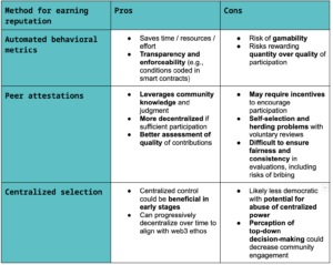 Because reputation systems are not simply purchased on an open market, the space for designing how reputation rewards are earned is wide. The table below summarizes pros and cons of different ways ecosystem participants can earn reputation: