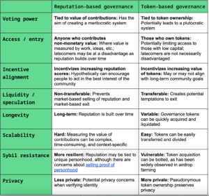 Token-based rewards are transferable while reputation-based rewards would be non-transferable. One might wonder which one should be used, and why. Early experiments in web3 governance have generally been token-based but are currently trending toward more reputation-based systems as a default given clear advantages if implemented successfully (summarized in the table below).