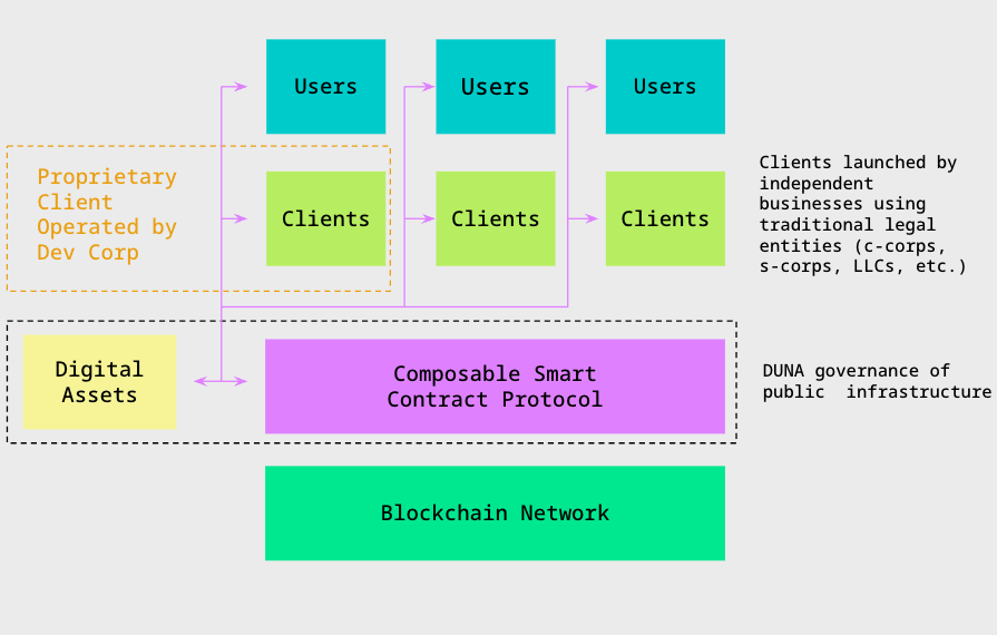 The DUNA solves these challenges without exposing consumers to additional risks. A DUNA can be used for the decentralized governance of open blockchain networks, but anyone building a consumer-facing application like a social media app, car service, or music streaming app on top of these open networks would continue to use traditional entity forms, like the corporation or LLC. And even though this paradigm includes the use of corporations, the fundamental difference is that corporations no longer control the underlying networks, they only control user-facing apps. That difference greatly reduces their ability to extract value like web2 companies do.