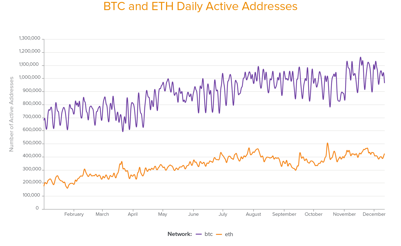 It’s not only existing users who are willing to pay to transact on these networks — more people are joining and becoming active, despite the prices. As this chart shows, the number of daily active ETH addresses has doubled this year, from 200,000 to 400,000. Bitcoin grew from about 700,000 to almost a million.