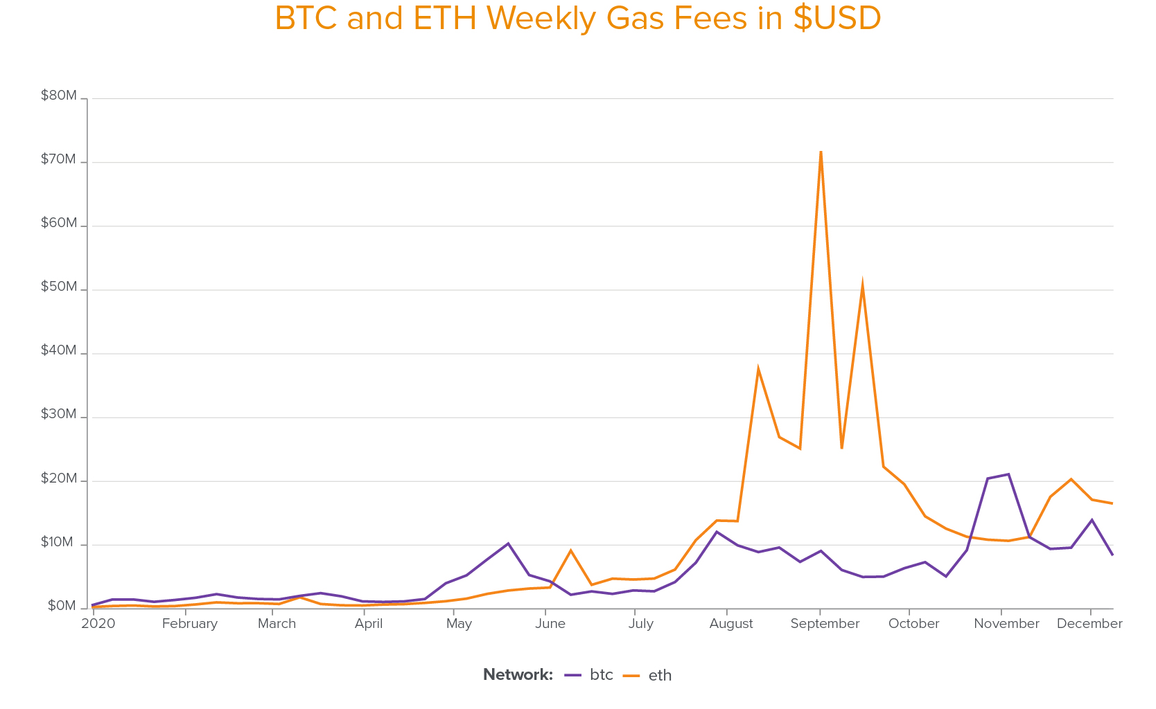 At the beginning of the year, gas fees on Bitcoin and Ethereum — the transaction costs for doing things like transferring an asset, using a program, or adding a new program — were in the hundreds of thousands and occasionally millions of dollars per week. Now, even after a leveling-off from the huge peaks of the summer, we’ve reached a new normal where the gas fees per week are in the double-digit millions.