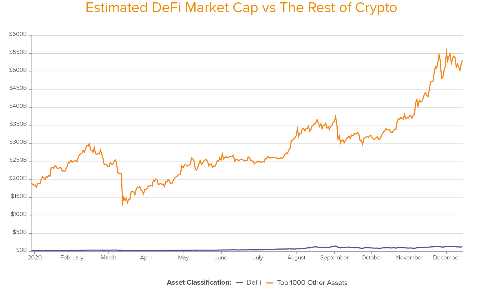 Source: CoinGecko. Compares the Top 1000 crypto assets by estimated market capitalization listed by CoinGecko as of December 15, 2020 against the Top 100 DeFi assets, minus stablecoins, listed as of the same date. Charts provided herein are for informational purposes only and should not be relied upon when making any investment decision. Past performance is not indicative of future results.