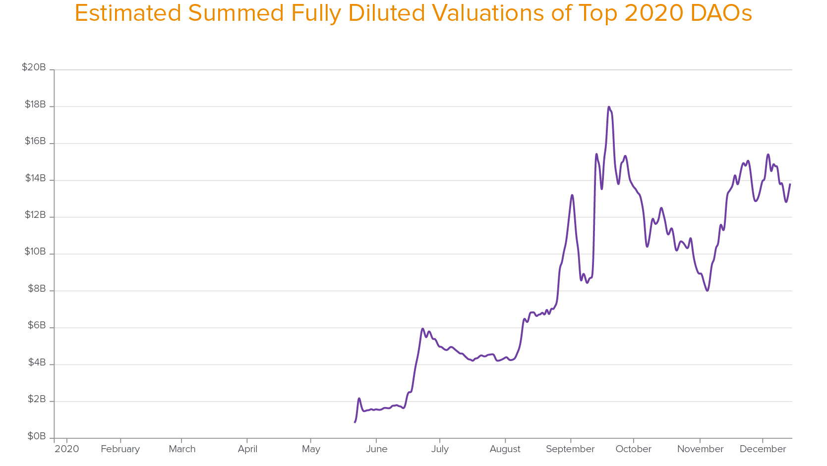 The concept of a DAO (decentralized autonomous organization) has been in crypto for a while, but this is the first year it’s become the norm for new protocols. The top 12 new DAOs in 2020 have a combined fully diluted market capitalization of about $14 billion.