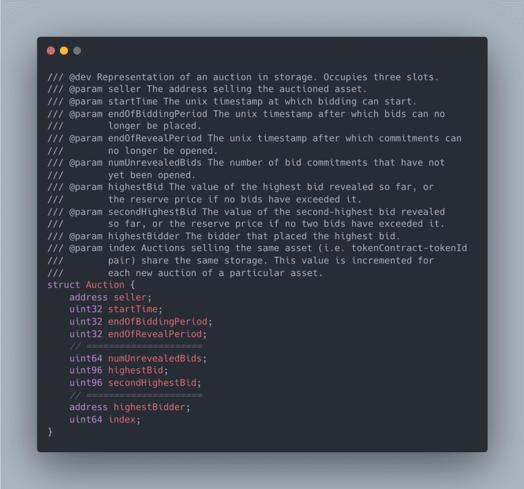 To demonstrate, we open sourced a Solidity implementation of an overcollateralized sealed-bid auction at github.com/a16z/auction-zoo, as a single-item (ERC721) Vickrey auction with bids denominated in ETH. We approached the implementation with three requirements for a sealed-bid auction smart contract in mind: