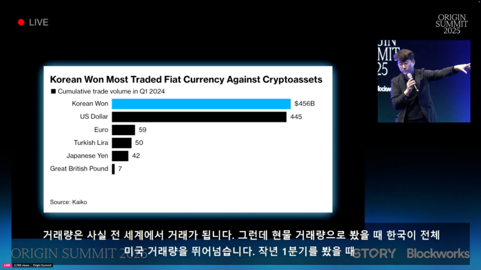 S.Y. Lee 님, CEO and Co-founder of Story Protocol, pointed out at Origin Summit that, according to Kaiko, Korean Won is traded against crypto more than any other currency including the U.S. dollar: