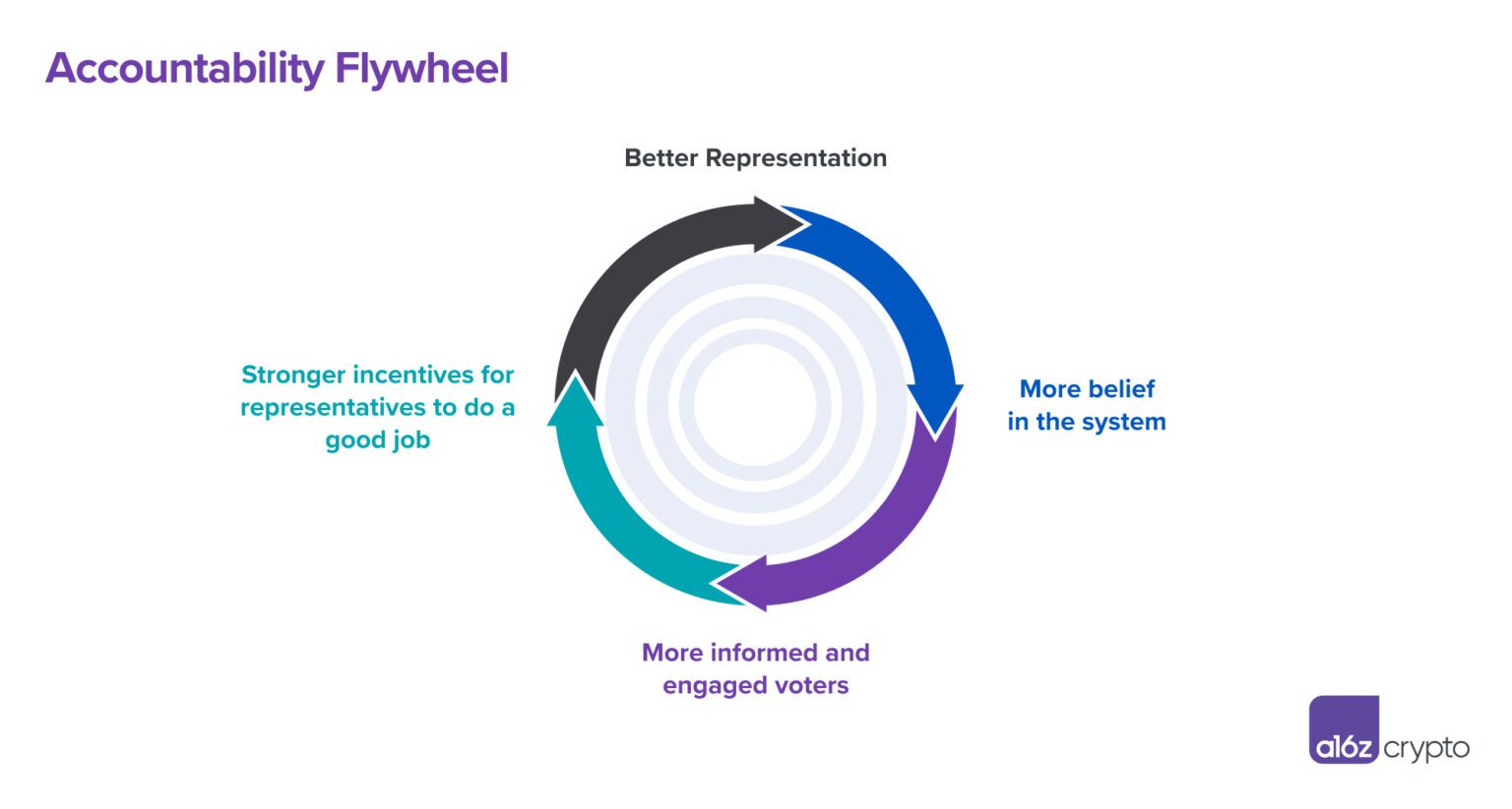 We call this the accountability flywheel. And web3 has a powerful tool to facilitate it—the token. Tokens can be used as a new vehicle for distributing economic, social, and political rights to stakeholders within an ecosystem. Much like how start-ups can incentivize employees with ownership, tokens can be used to incentivize contributors and users to continue building value on a network.