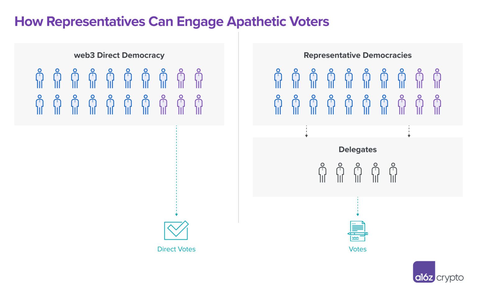 In our view, philosophical parallels to Madison’s logic exist in web3 today. The primary impediment is no longer physical travel, but system complexity. We expect to see more sophisticated and widespread forms of representation within web3 governance continue to develop as an antidote to rising complexity. From a first principles perspective, web3 communities need to decide on the political system design and social contract between actors in the ecosystem before applying the specific tools to implement them.