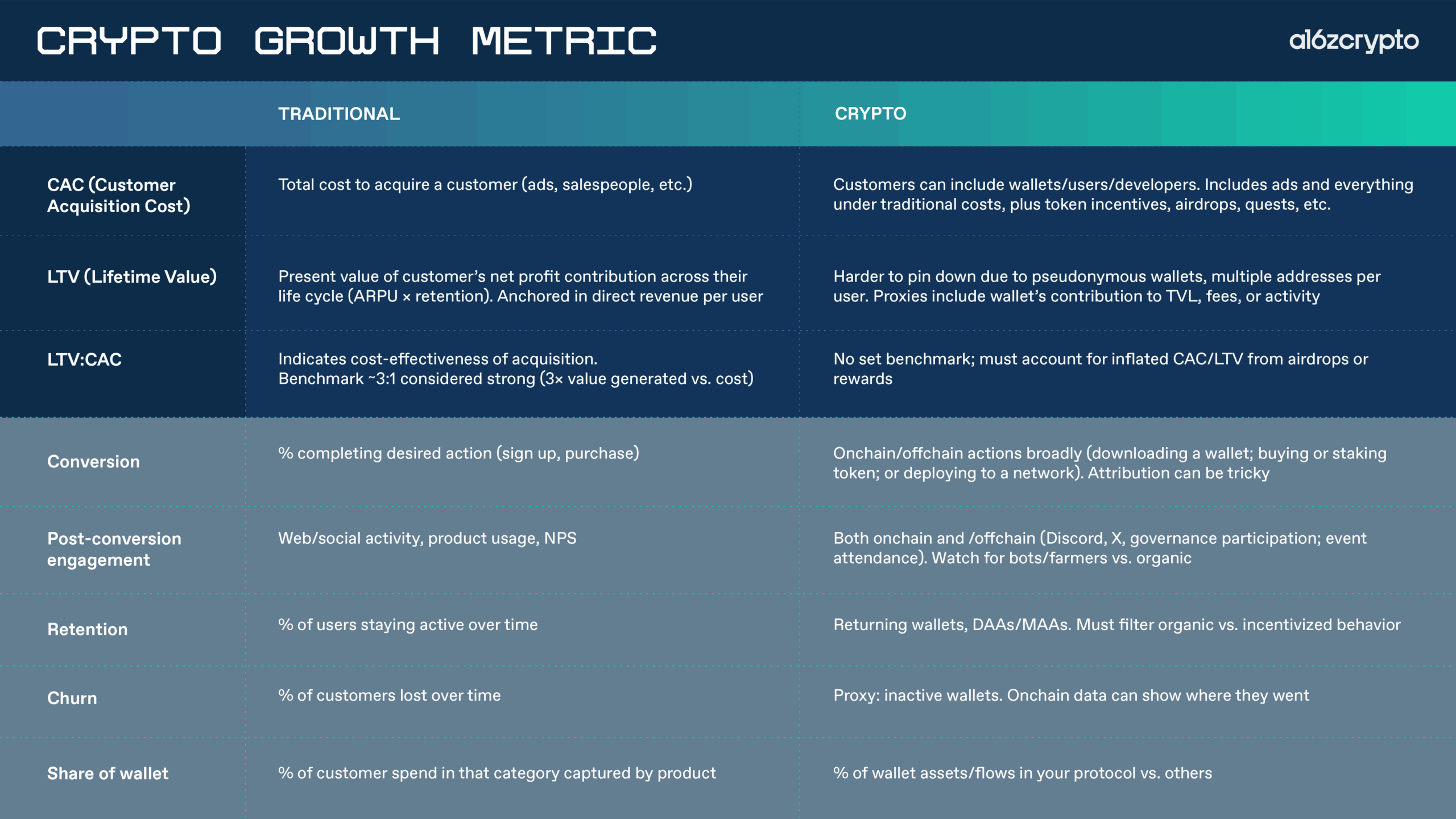 While these concepts are well established in traditional SaaS, they require some adaptation in crypto contexts where “customers” often mean “wallets”, and where value creation can look different. We redefine these metrics below, along with nuances specific to crypto.