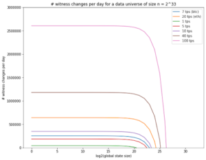 This means that even if a user Alice makes no transactions, her witness might need to change as other users transact. As long as the succinct state stored by validators is too small to capture the full state (i.e., the set of all account balances), increasing the succinct state size helps little. We plot this relationship as implied by our theorem below, along with the number of witness changes required per day for blockchains of various throughput. These plots show the number of times witnesses will need to change for the best possible stateless blockchain. Here, the data universe refers to the total number of accounts (in the account model) or UTXOs (in the UTXO model).