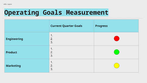 Below an example of a simple measurement system for tracking progress on your goals. With the red/yellow/green metrics, you could bring them to a weekly leadership meeting to give a quick update on the goals that are going well and the ones you’re concerned about. In this example, you might share that product is fine, marketing had a hiccup but you’re not worried about it, and engineering hit a serious problem that the team should discuss. Obviously, the system isn’t complicated, which is the point — find ways to monitor the operating plan and hold people accountable that aren’t too cumbersome.