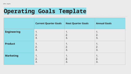 You’ll iterate on the operating plan over time, so don’t overthink the first draft. There are lots of best practices — lots of frameworks, lots of expensive consultants you could hire to help. But the core job is to clearly articulate who’s doing what in the company — and you can get that down on paper yourself, even if you need help polishing it later. For now, just aim for clarity and structure in your operating goals for a period of time.
