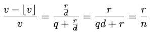 The real (mathematical) division result v is n / d = q + r / d, while the integer division result (as performed in Solidity) is ⌊v⌋ = q.
