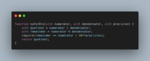 Numerical errors in DeFi protocols, after the adoption of safe math as the default, are rounding errors. Rounding errors arise from one operation — division. So how can we ensure that a division introduces less than a certain fraction of error? We check the remainder.
