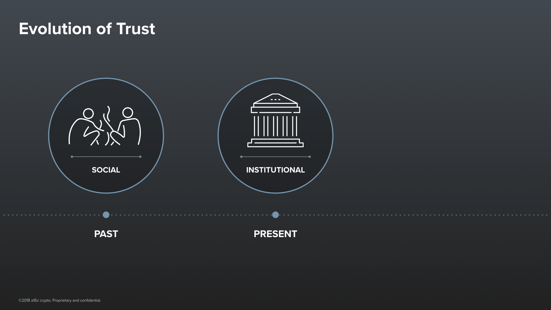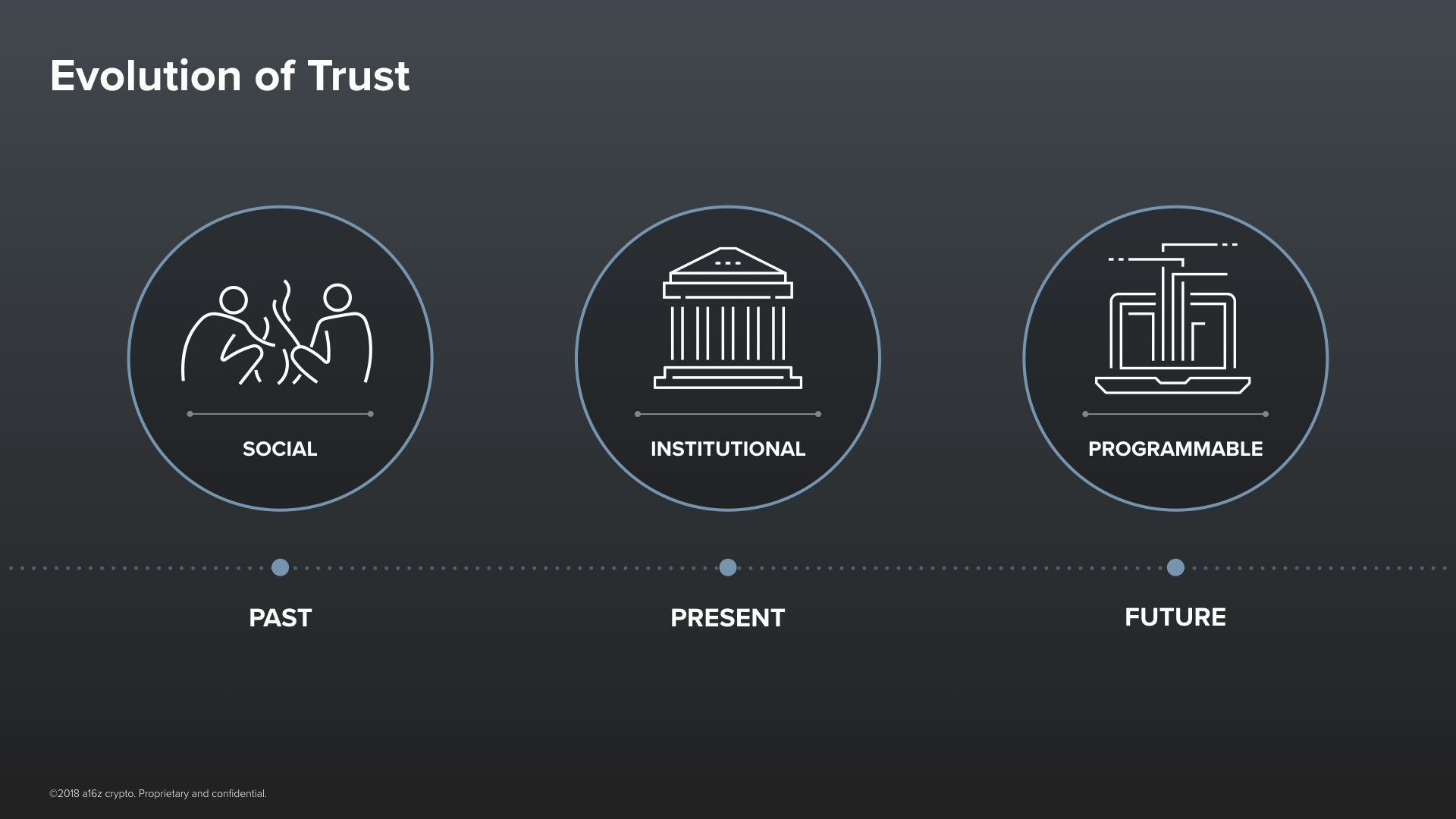 The rise of human civilization is a story of ever-increasing scale of cooperation. Even today, it’s hard to conceive of pressing human problems that can’t be solved primarily through more cooperation—cooperation between people who might reside across political divides, speak different languages, and adhere to fundamentally different ideologies. So much of what we have built, our greatest successes as a species––like the Internet or space travel––have been efforts that are truly global. But how is this scale of cooperation even possible?It is all driven by trust. Trust is an elusive concept. It is a word that we use a lot, but what does it actually mean? When you boil it down, it’s a certain kind of confidence that doing something or interacting with someone is likely to go well for you.Throughout history, the kinds of things that we have relied on to build trust have changed dramatically. We started as nomadic hunter gatherers, basing our trust on things like facial expressions and body language––the biological signals that we instinctively cue into when we interact with one another. This model of trust was Social.Over the many millennia that have followed, human institutions––like churches, schools, local governments, and then nation states, and corporations––have come along, and they have gone a long way to help us scale trust from the very local, where everyone knows one another intimately, to the nearly global, where everyone is a stranger. Let’s call this model of trust Institutional. It’s the predominant model of trust today.