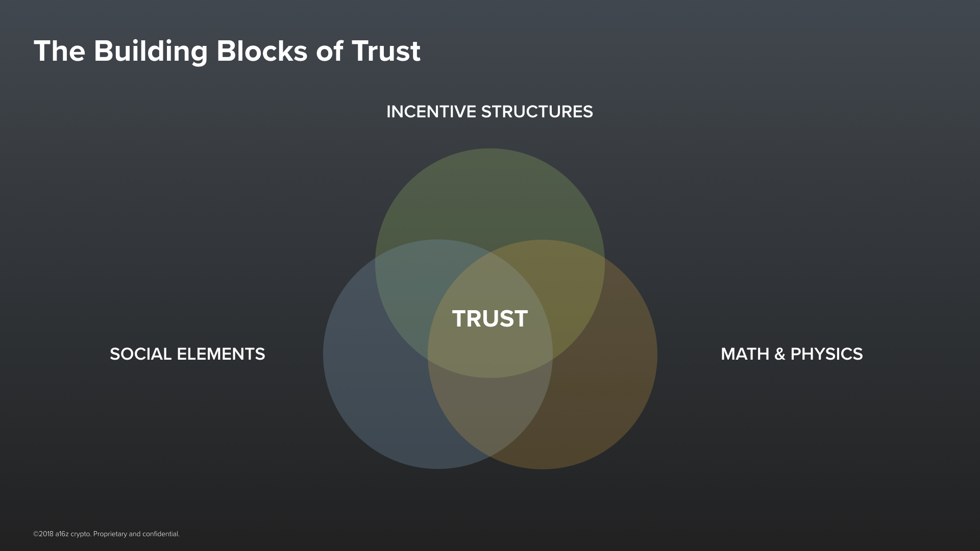 Our technology, and especially our software, has been immeasurably successful at improving a lot of things. But it has only begun to scratch the surface of the world of trust. I will argue that since the creation of the Internet, we have begun to discover a new paradigm for trust.It is a kind of trust that is programmable. It is enabled by software, and its guarantees are based on something more fundamental than the authority of a human institution. To explain what this means and how it works, I need to take a moment to break down trust further into its elemental building blocks. There are really two important components of trust. Two elements that together combine to form all of our trust in people––be it individuals or institutions––and our trust in technology.