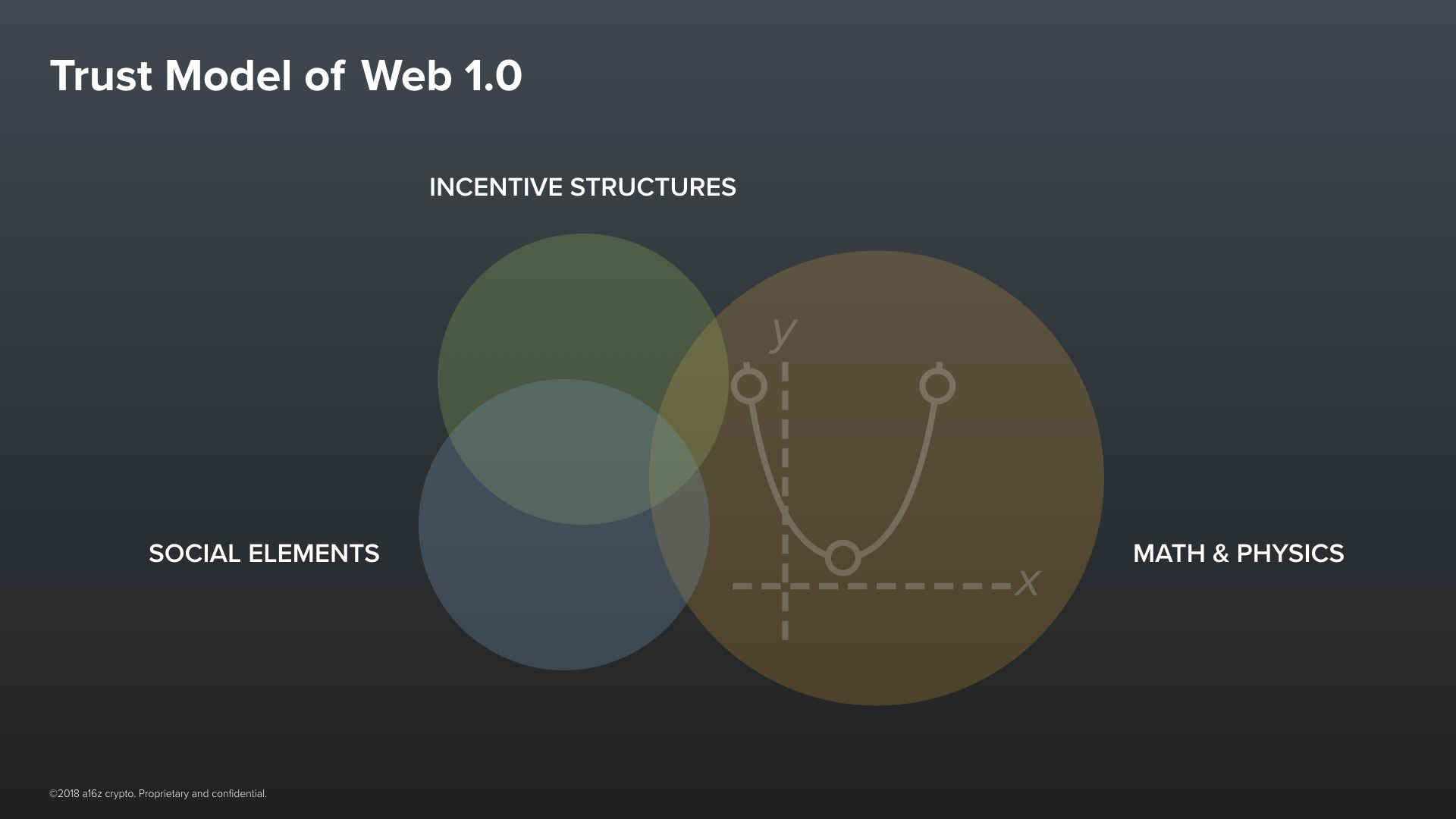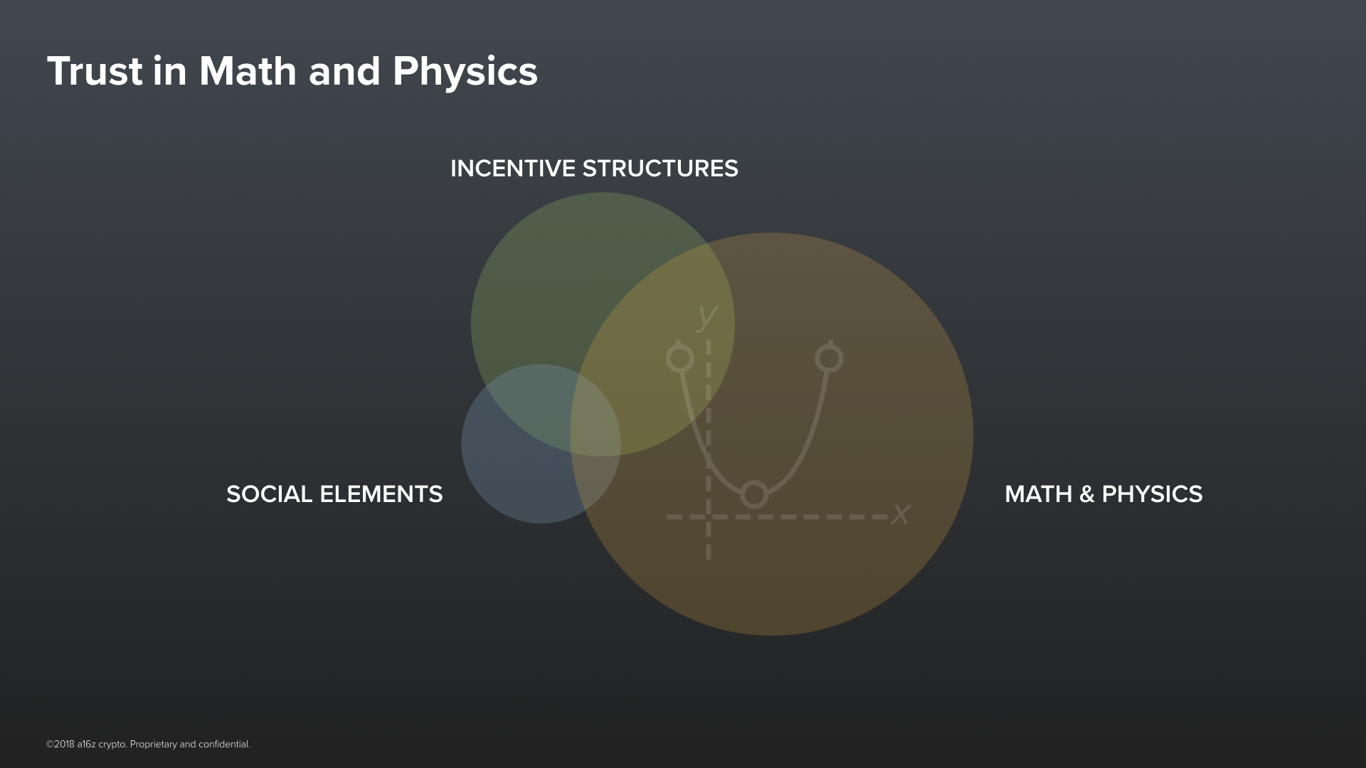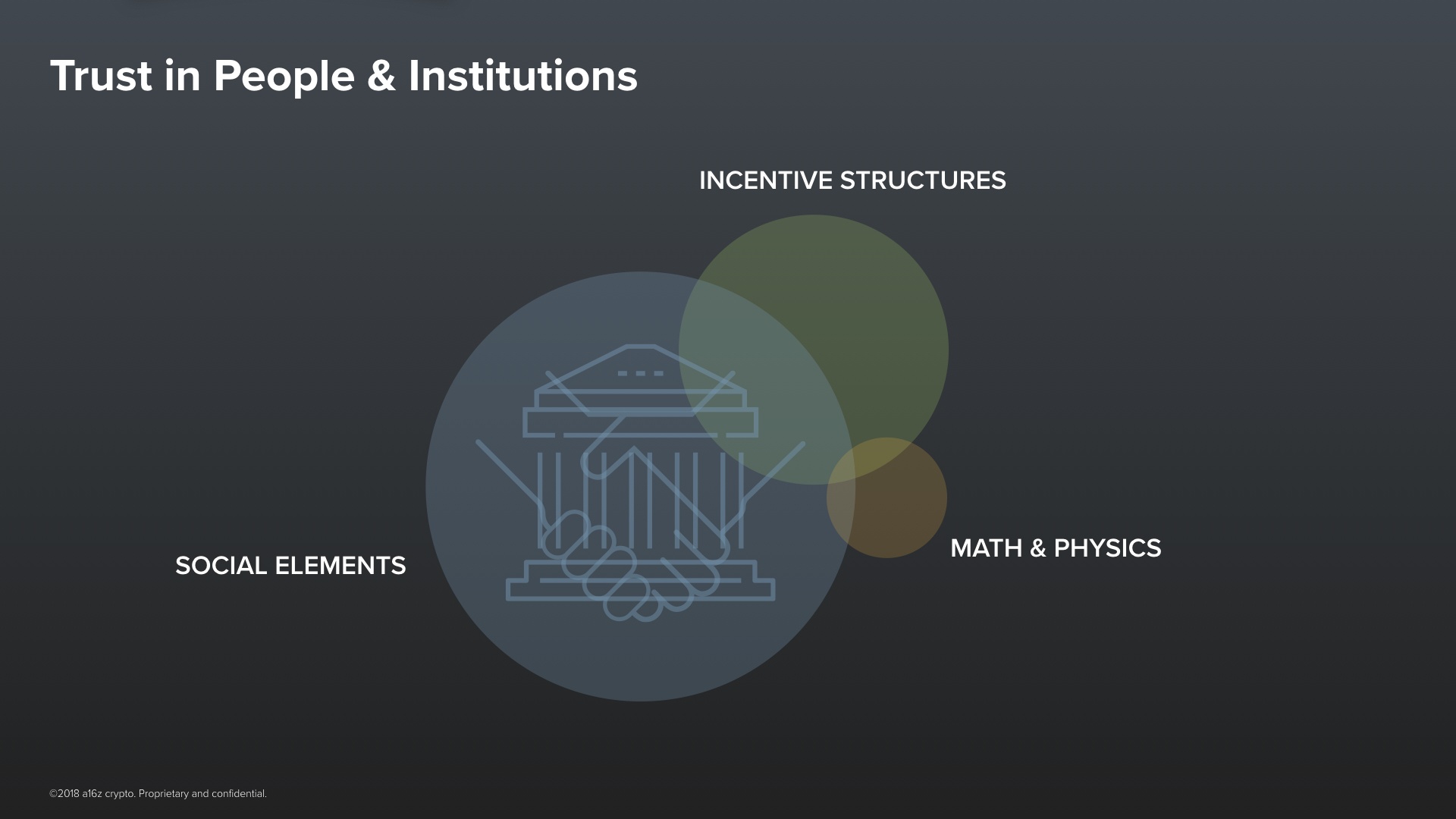 The second component comes from our knowledge of the physical world. It comes from our understanding of things like Math & Physics. It is the kind of trust that gives us confidence that doing something like landing on the moon is even possible. These two components can be used as building blocks for a third component. A third building block that we can use to create trust–and that is Incentive Structures.Now, some incentive structures are built primarily from things that are physical –– things in the orange circle. For example, we tend to trust that the physical difficulty of forging a U.S. dollar bill is enough to disincentivize most people from trying. It’s just not worth it. And of course, it also happens to be illegal, which itself is a disincentive. But that one looks more like this.It is made up of people. Most of our incentive structures are made up of people––they are social constructs. Think of our legal contracts, or government regulation, or of insurance. Or think of the many agreements we make all the time implicitly with companies whose Terms of Service aren’t exactly written by J.K. Rowling.
