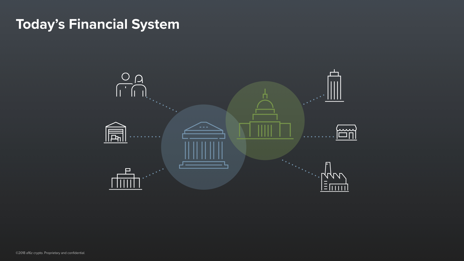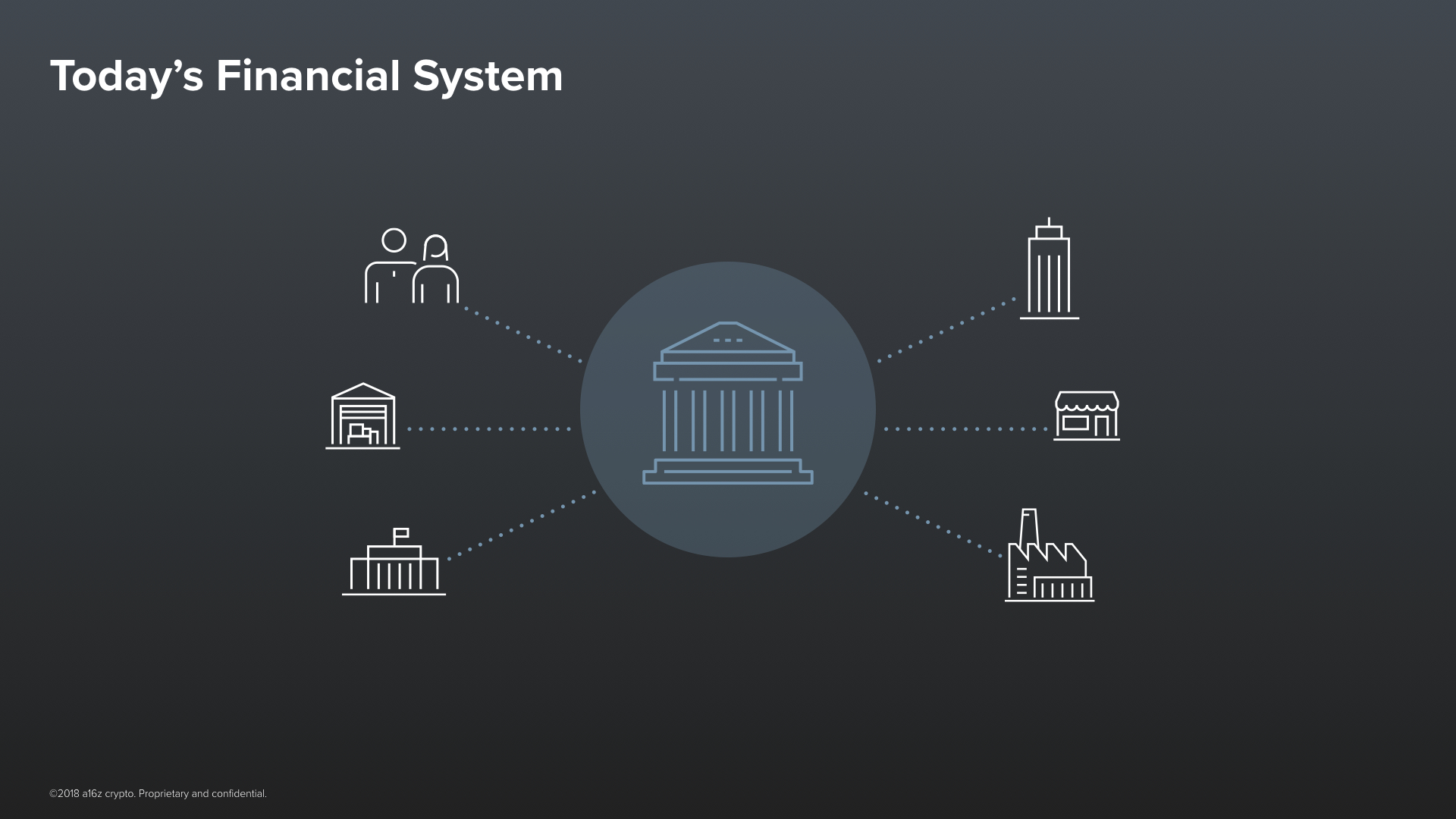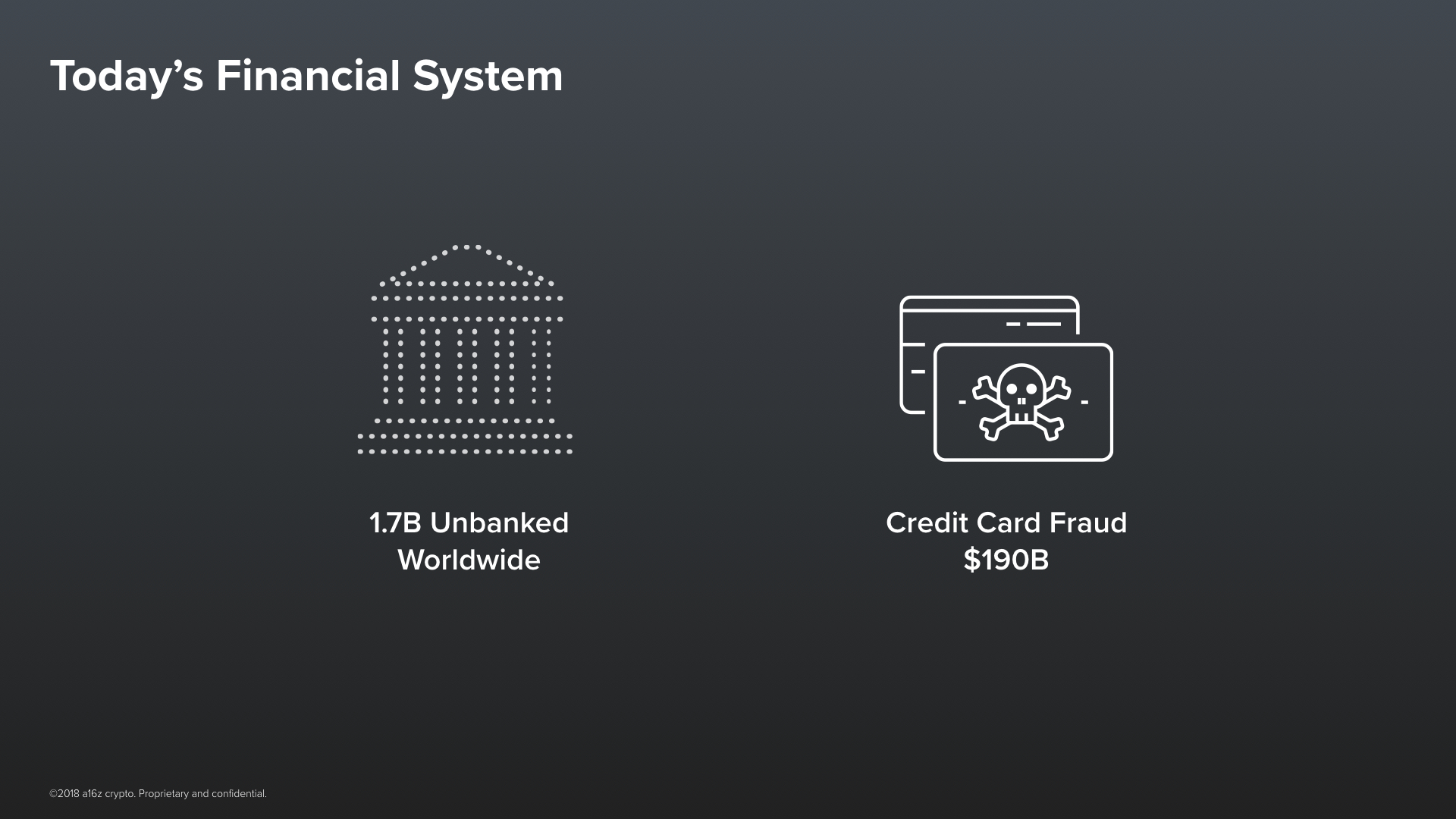 In our current financial system, the integrity of any transaction depends on the trustworthiness of the human institution––a bank––that sits in the middle of it.And the only reason we trust banks is: because they have a track record, they have a reputation, and because there are legal incentive structures around them. Take, for example, credit cards. They’re not very secure. But the reason that you are willing to trust them is that, if someone charges something to your card, you can just dispute it after the fact. An entire team of trusted humans will then readily get involved and get you paid back! Our trust in our financial infrastructure today is based, not on technology, but on this human-driven possibility for recourse.This institutional model of trust works in the first world but it simply cannot scale to 8 billion people. As Katie Haun mentioned in her talk about why she got interested in crypto, two billion people in the world today are completely unbanked, credit card fraud cost $190B last year, and fewer than 5% of people in the world hold any investments in stocks or government bonds. Now in contrast to this limited system, I’d like to give you an example of how trust can work differently.