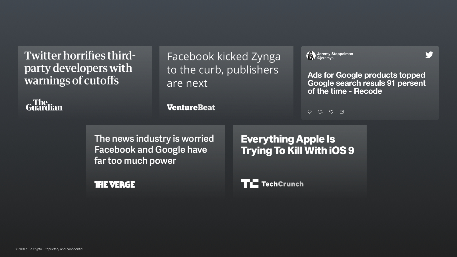The technology in this space is still very nascent. This is the very beginning. Countless building blocks are still missing. There are many problems: problems of performance, of privacy which is still missing, of custody and key management, of identity, of protocol governance, and of developer and of user experience. The list goes on, but as these limitations are gradually addressed it will become possible to use this new set of Lego building blocks to build things that we can hardly imagine today––things as complex as Search Engines and Social Networks that will become platforms in their own right. Like the protocols of Web 1.0, the cryptonetworks of Web 3.0 are open source, collectively owned, and can be trusted to remain neutral.We see this as the foundation to another wave of innovation that is just as large if not larger than the startup ecosystem on the Internet so far.