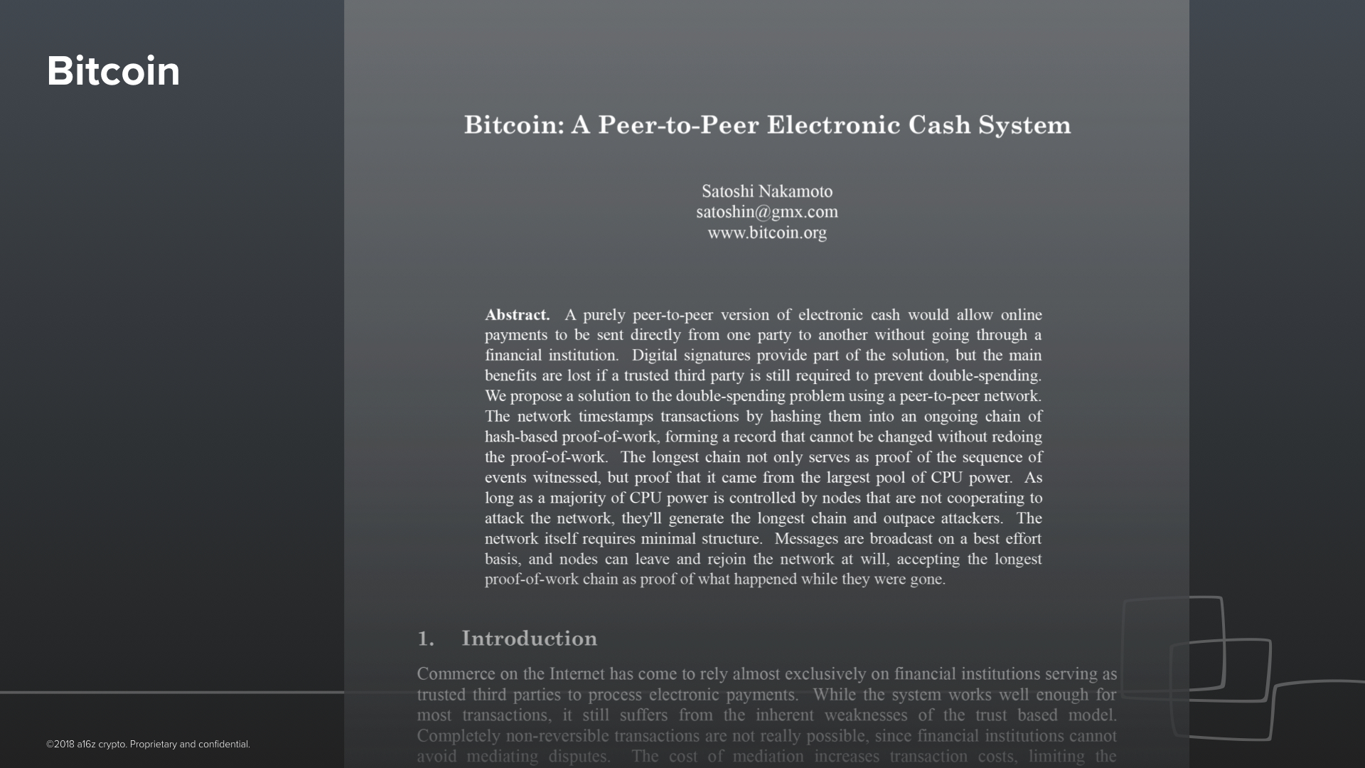 Now, of course, building such a database is hard because someone has to do the work of keeping it honest. Traditionally, we have relied on intermediaries like the tech giants, as well as banks and governments to keep our databases secure for us. What we want instead is for trust in the database to be based on Math and Physics. In other words, it must be self-policing.Almost exactly ten years ago, the Bitcoin paper was published. The idea behind Bitcoin is to leverage the primitives of cryptography like digital signatures, the open protocols of web 1.0, and a very clever incentive structure to build a collectively owned and neutral database of Bitcoin transactions––of payments.Now, what is truly novel about this database is that its security emerges bottom up from its users –– users who can be anyone, anywhere, and can participate without anyone’s permission. In other words, control over the database is literally decentralized––there are no gatekeepers. The challenge is, of course, that many of those participants are no doubt dishonest and they would rather like to game the system for a profit, if they could. The genius of Bitcoin is an incentive structure that makes it self-policing. It is valuable to have at least an intuition for this works. Instead of keeping a single copy of the database inside of some trusted data center owned by Google, each participant in the network keeps their own copy. But there’s a problem: how can we make sure that all the copies of the database stay consistent, and that nobody can insert a fraudulent transaction?The answer is that each participant in the network, known as a miner, monitors the network and votes for the sets of transactions that they believe are valid. The twist is that they vote with their computational power. Consider Alice –– she’s a miner. The more of her computational power she offers to the network, the more secure she helps make it. And as a result, the protocol gives more voting power and a bigger reward.