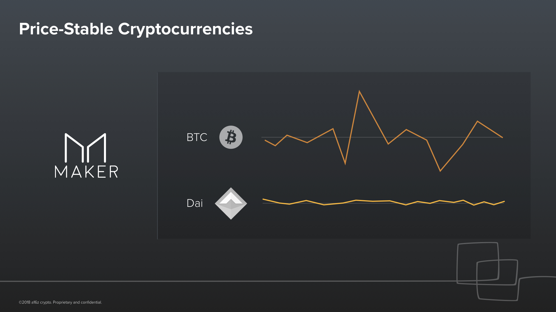 Let’s work through some real world examples of what you can do.An ingenious application of this idea is a cryptocurrency––Dai––whose price is stable with respect to the dollar. One Dai is always worth $1. This is what Maker is building. The beauty of Dai as a cryptocurrency is that it has all of the advantages offered by Bitcoin, but it is also price stable. Because of its stability, it has a real chance to become a digital alternative to fiat for the two billion people who are unbanked or the hundreds of millions of people in countries with hyperinflation. Maker launched Dai almost a year ago. It has been in circulation ever since, and it has been successful at maintaining its peg. Now, you might think this whole idea should impossible. I mean, the price of something is always decided by the market, right? But the idea behind Dai is clever.