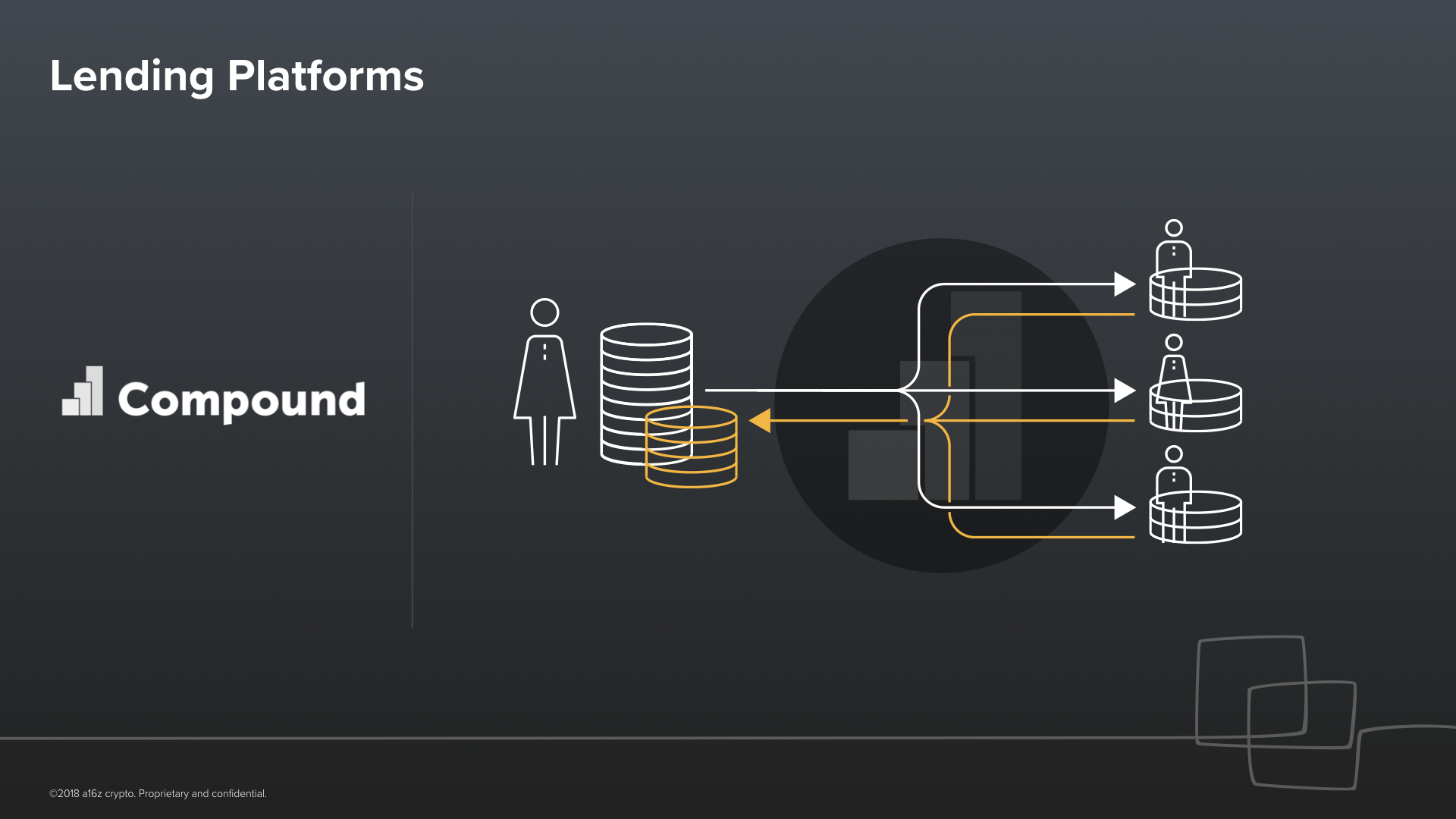 Now take a second to think about this. Dai is not just a price-stable cryptocurrency. It is also a lending platform where loans are originated and margin-called entirely in software without trusted human intermediaries –– no banks. Now I don’t know about you, but I think this is really cool. The glimpses that things like Dai offer of the future are really what get me out of bed and into work every day.Let’s take the idea of lending further. Compound is a company that has built a program that runs on the Ethereum world computer that acts as a kind of money market. Anyone can lend crypto assets to the program, and the program will then, in turn, lend out those crypto assets to others. The interest rate is algorithmically set, and again, no trust is placed on human intermediaries.