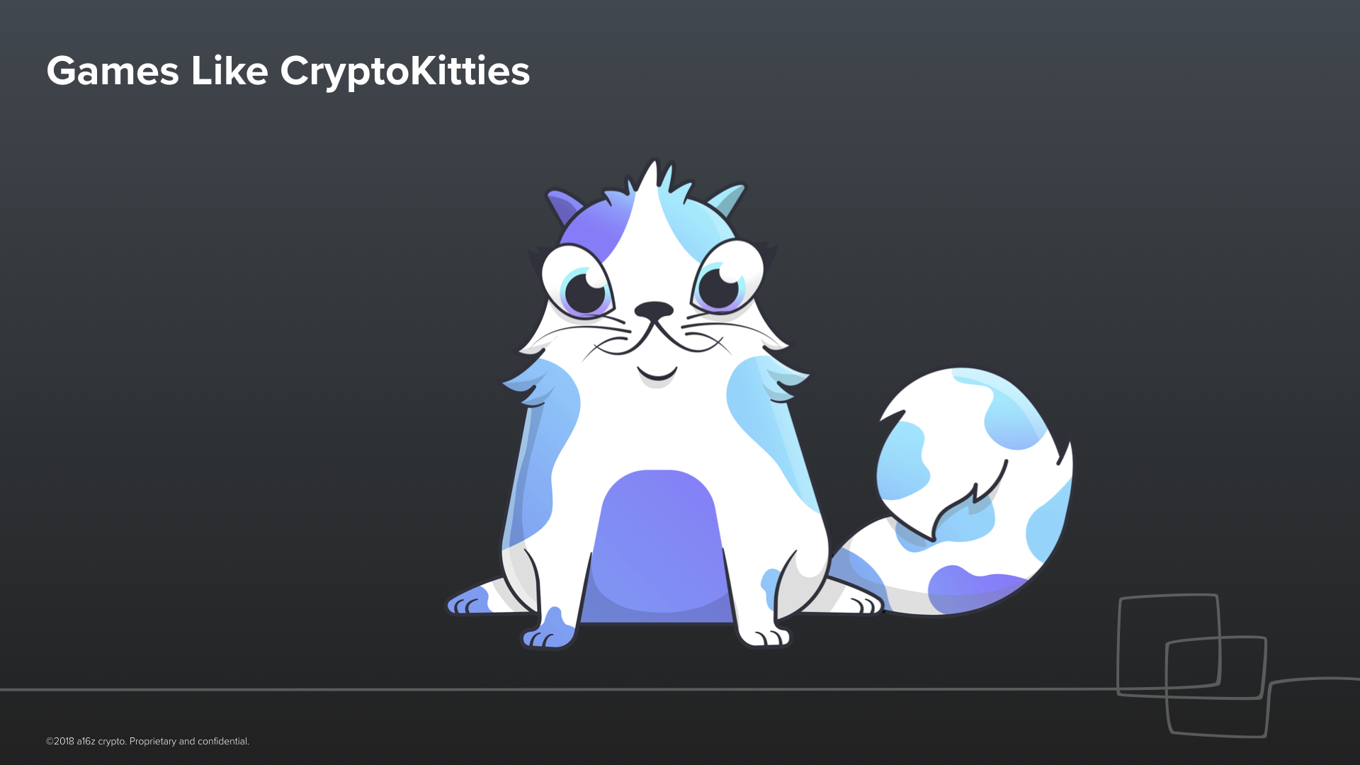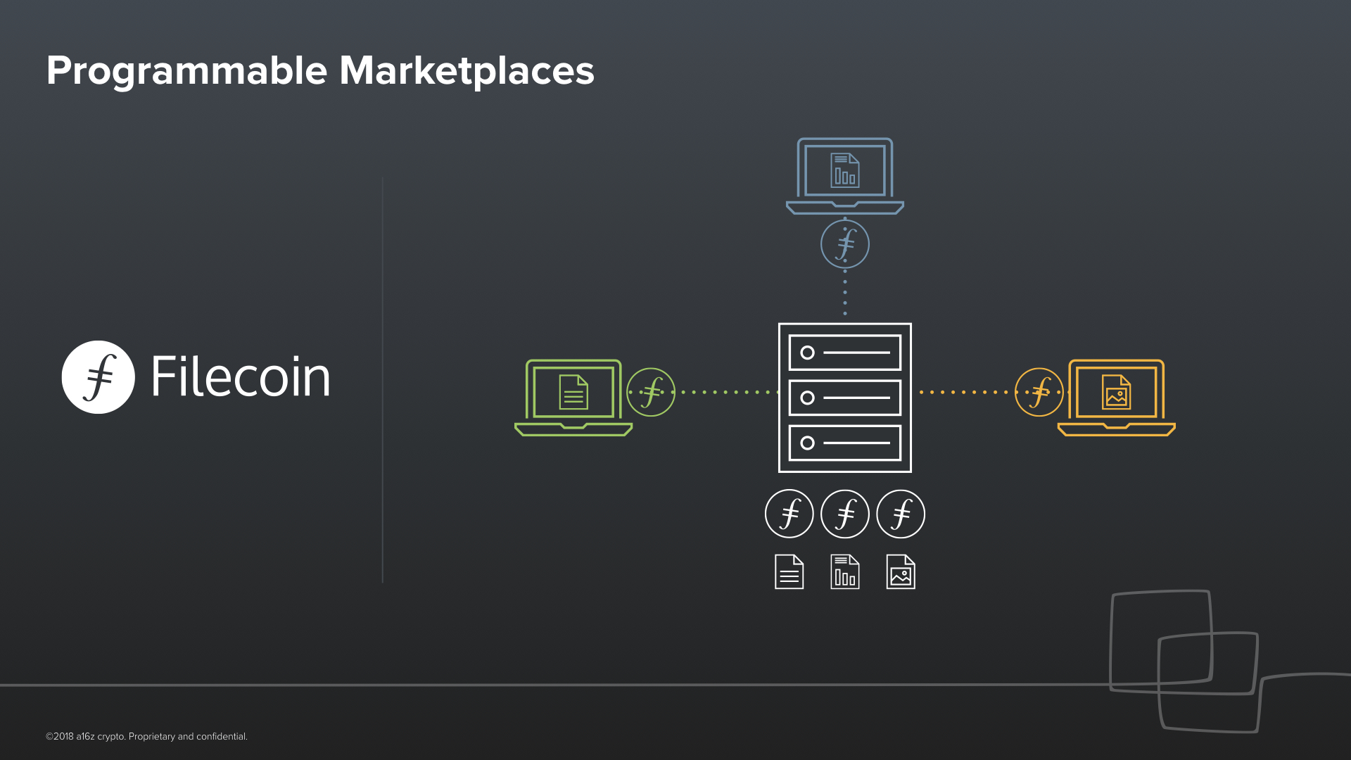 Now think of what you could do if were to combine Compound with Dai, as a stable currency to lend and borrow, and were to add a friendly user interface. This starts to look a lot like a consumer bank. But one that’s built entirely in software, end-to-end.Let’s go beyond just finance. What else can we do with programmable trust? One example, is a programmable marketplace like Filecoin. I can rent you the spare storage space on my laptop, and you can pay me for it in Filecoin. Crucially, you and I could be complete strangers and live across the world from another. You can trust that I will store your files, and I can trust that I will get paid for storing your files, because of the mathematical rules and incentives of Filecoin. And again, this works without intermediaries, just the protocol.This is a CryptoKitty. I happen to own this CryptoKitty. And I also happen to be too embarrassed to admit to you how much I paid for this CryptoKitty. So this CryptoKitty is mine; it’s like some sort of digital, collectible beanie baby or tamagochi (if any of those words mean anything to you).