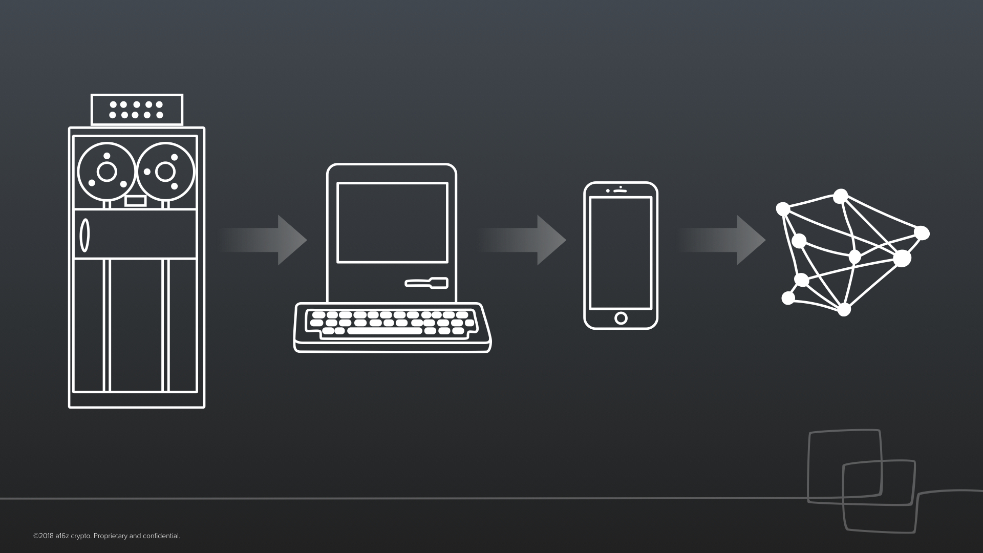 We can hardly hope to imagine what this wave will look like when all is said and done, but we can already see the beginning of a progression: it starts with solutions to some of the inefficiencies in our financial system; it progresses to fully programmable marketplaces like Filecoin; to the first crypto enabled games, like CryptoKitties; and finally to an architecture for the Internet that can serve as a platform for the yet uncharted Web 3.0.This is a fundamentally new paradigm for computing. We’ve gone from mainframes, to the personal computer, to the smartphone era, and now onto cryptonetworks. The key feature of this new paradigm that was previously unheard of is that trust can now be software–it is programmable.And, through programmable trust, cryptonetworks stand to enable human cooperation at a scale that is completely unprecedented. Trust is becoming unbundled, decentralized, and inverted –– instead of flowing top down from institutions to individual people, it is now beginning to emerge bottom up from individuals and software.
