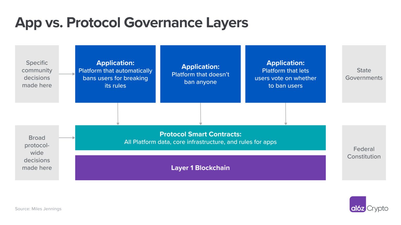 - A minimum amount of governance at the protocol level enables the greatest amount of freedom and flexibility at the app level.