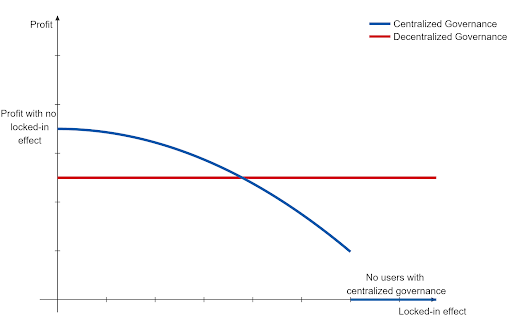 As the locked-in effect increases, the red line depicting the profits with decentralized governance does not change. But the profit with centralized governance – the blue line – slopes downward as the locked-in effect grows. This may seem counterintuitive because a larger locked-in effect allows the entrepreneur to achieve higher profit in the exploitation phase. But in total, it is more expensive to induce users to join the network than the profits that can be generated from exploiting them in the future. The result, perhaps surprisingly, is that profit with centralized governance will eventually fall below the profit that can be achieved with decentralized governance.